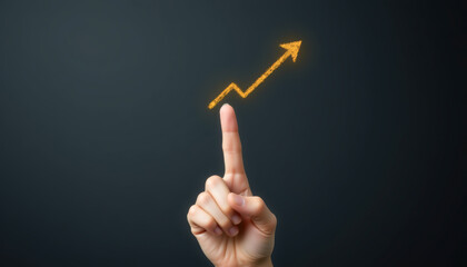 Man pointing to upward trending arrow chart indicating growth and progress in business or finance on white background with success