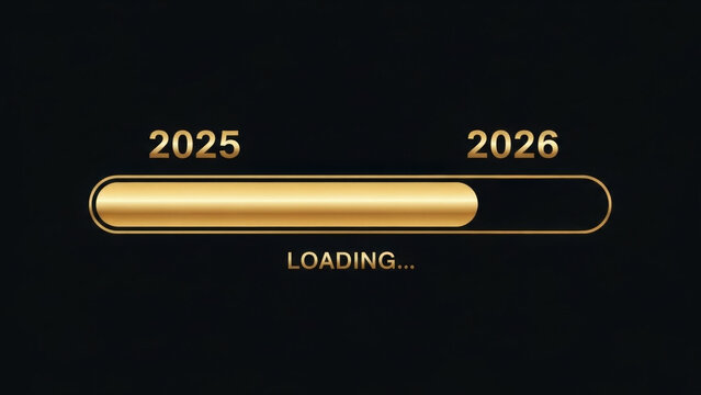 Golden progress loading bar illustrating transition from year 2025 to 2026 with text indication
