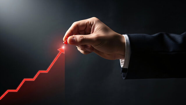 Graph with growing indicators and a female hand with a marker on a blue background. The concept of successful sales in business, inflation and rising prices