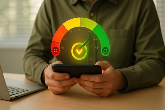 Person holding smartphone with glowing performance meter showing satisfaction score and efficiency level in green zone
