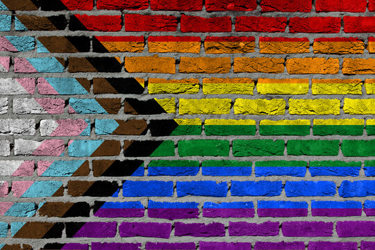 Progress pride flag (new design of rainbow flag) waving in the air with blue sky, Celebration of gay pride, The symbol of lesbian, gay, bisexual and transgender, LGBTQ community
