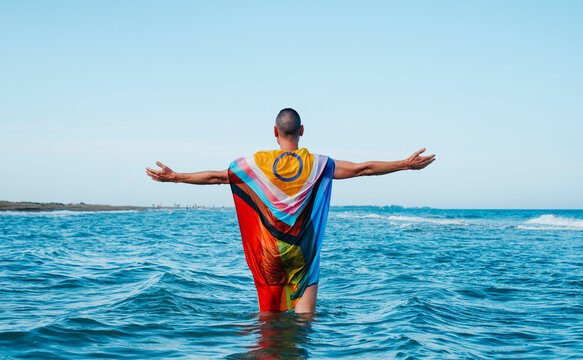 Confident person draped in rainbow flag embracing lgbtq+ identity