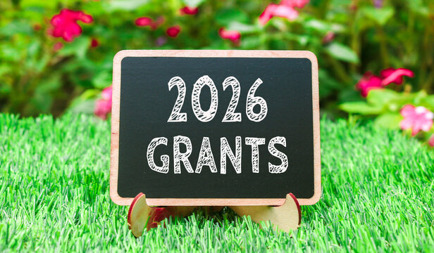 2026 GRANTS on chalk blackboard on green grass with natural background. Concept words 2026 GRANTS on beautiful black blackboard.