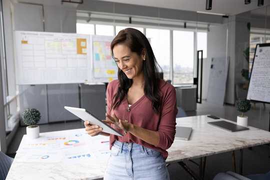 Manager presenting business infographic to team in modern office