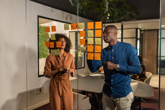 Business team brainstorming and planning using sticky notes on glass wall in office