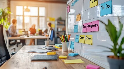 Office desk with sticky notes on whiteboard tracking project progress in creative work environment