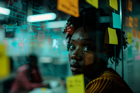 A person is standing behind a glass board covered with colorful sticky notes and complex writings, illustrating a brainstorming session or creative collaboration.