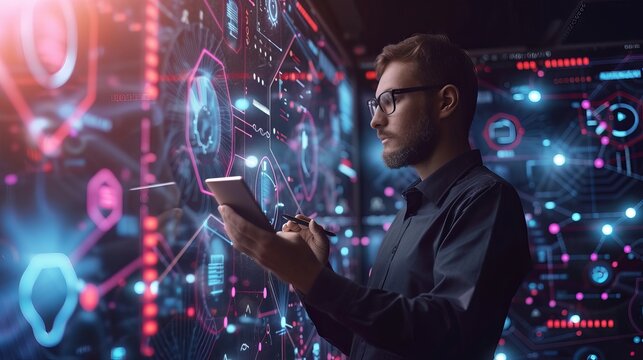 Engineer collaborates on digital twin construction project using bim and advanced modeling software
