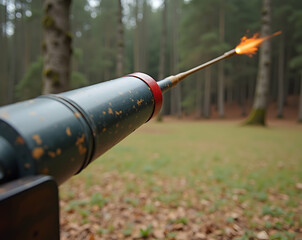 A demonstration of projectile motion with a cannonball illustrating physics concepts, set against a natural backdrop, showcasing trajectory and velocity in action