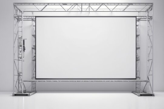 Large blank projection screen mounted on a metal frame structure