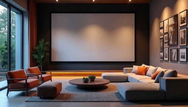 Modern home theater room with large projection screen and comfortable sectional sofa. Orange armchairs and ottoman provide accent seating. Gallery wall art complements the dark walls.