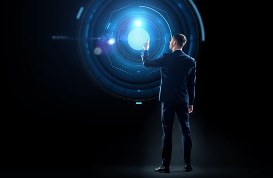 Businessman holding and touching holographic drone projection in his fingers 3D rendering