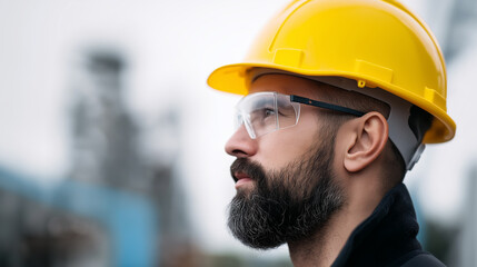 Close-up profile of a construction worker wearing a yellow hard hat and safety glasses, looking focused.