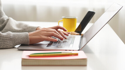 Close-up of young woman typing on laptop keyboard at modern workspace with notebook and yellow mug. Symbolizing AI work, entrepreneurship, telework, study, and research.