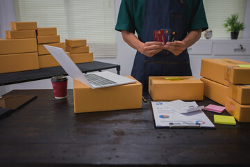 An Asian man carefully prepares a package for a customer's online order, methodically placing items in a box, sealing it securely, and attaching a shipping label for prompt delivery.