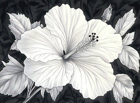 Detailed black and white illustration of a large hibiscus flower with pronounced veins and surrounding leaves on a dark background, evoking elegance and tranquility
