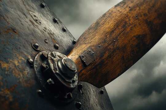 Close-up of a weathered wooden propeller affixed to a rusty metal hub, against a stormy sky.