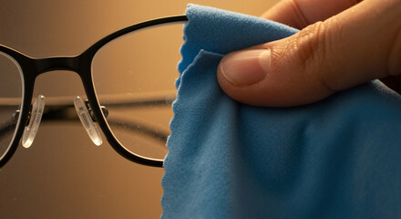 Vision Correction Cleaning Glasses with a Cloth Against a Warm Background