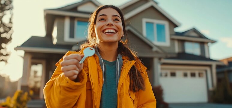 House-shaped keys are hanging from the door knob of a new home, representing the exciting moment of acquiring property and starting a fresh chapter