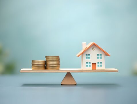 Wooden house model and stack of coins balanced on a wood scale, symbolizing property investment, financial balance, and the comparison between home value and money
