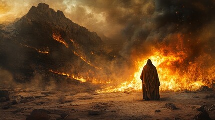 Moses stands before the burning bush in a rugged desert, surrounded by flames and smoke that rise against the dramatic backdrop of mountains