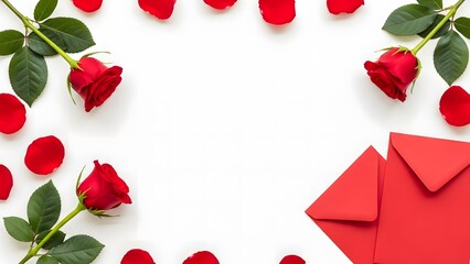 Festive Arrangement of Romantic Gifts, Vibrant Red Hearts, and Fresh Roses on a Gentle Pastel Background, Perfect for Celebrating Love and Special Moments