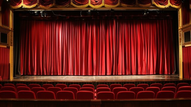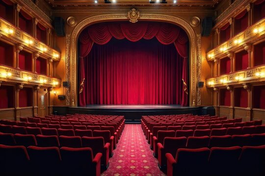 Grand Theatre Stage: Capture the opulence of theatre, an empty stage framed by ornate gold detailing and a rich red curtain, evoking the anticipation of a performance.