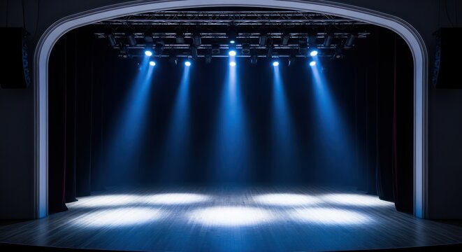 Captivating stage ambiance with illuminated blue spotlights awaiting a performance spectacle