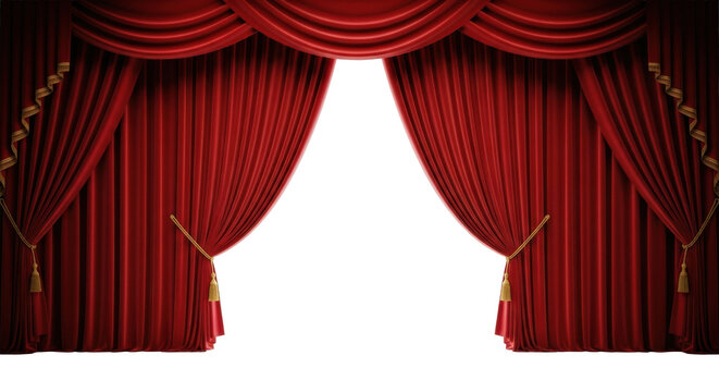 empty theater stage with red velvet curtains, draped swags, dramatic spotlights and golden dust creating a grand anticipatory atmosphere