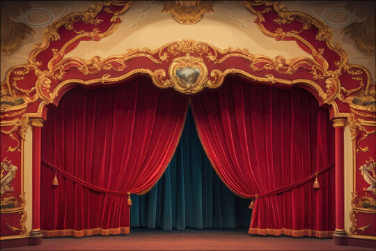ornate theater stage with luxurious crimson velvet curtains golden tassels and antique footlights casting a warm glow intricate baroque details adorn the proscenium arch
