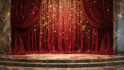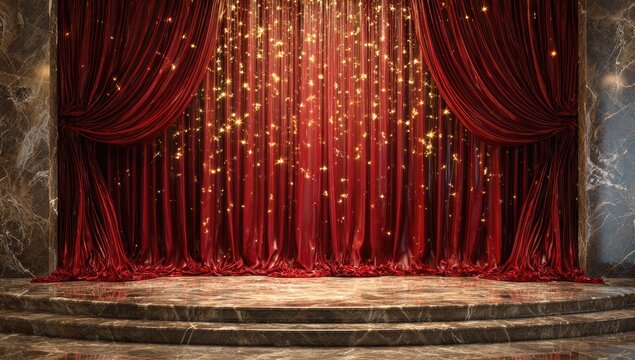 A theatrical stage with luxurious red velvet curtains and sparkling golden lights