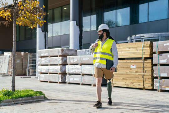 Caucasian male with beard and safety gear stands at construction, prosthetic leg visible.