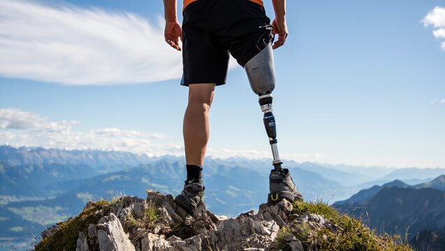 Individual with a prosthetic leg stands triumphantly on a mountain peak, overlooking a breathtaking landscape of valleys and distant mountains, embodying resilience and the spirit of adventure