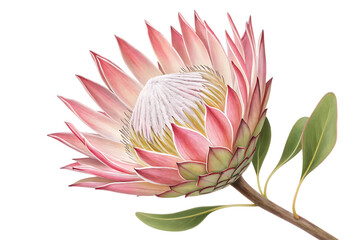 Isolated protea flower with stem and green leaves