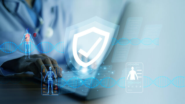 Doctor pushing button locked shield virus security virtual healthcare network medicine