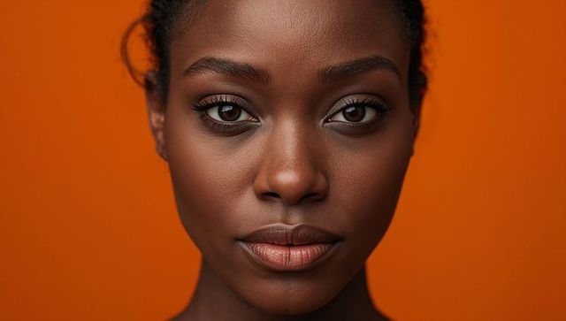 Posing african american woman highlighting flawless skin on warm orange backdrop, closeup