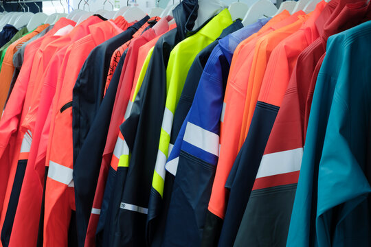 Selective blur on high visibility safety coats and jackets, personal protective equipments, for sale outside, fluorescent colors. These coats are made to be visible on workplace in any condition. ..