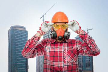 Professional chemical workers in protective suits and gas masks handle hazardous materials inside a chemical manufacturing plant.