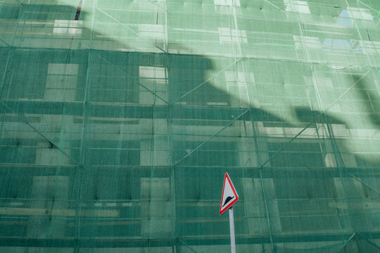 Construction site with green netting and warning sign in sunlight