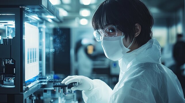 A focused researcher wearing protective gear delves into data in an advanced lab setting, epitomizing modern scientific pursuit and technological progress.