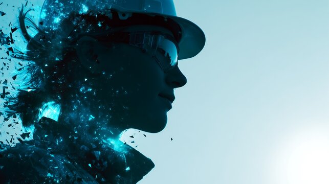 A close-up of a focused individual wearing protective goggles, observing a vibrant stream of light, suggesting themes of science and innovation.