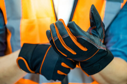 Male construction worker with reflective orange vest putting black protective gloves on his hands. Workwear for builder, foreman or engineer