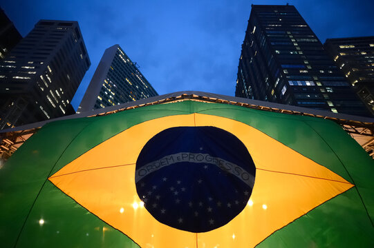 Brazilian flag at street with high buildings at night. Brazil's national symbol backlit. Patriotic growth concept.
