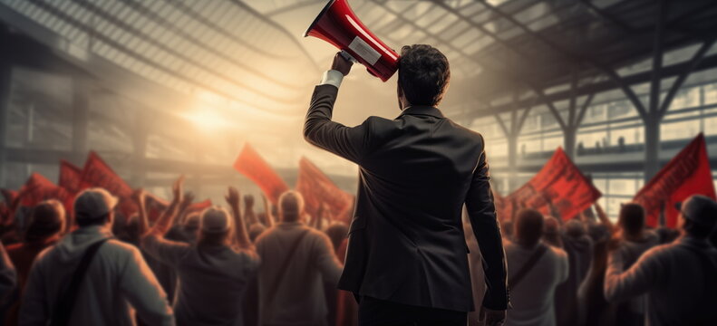Female activists protesting with a megaphone during a strike. Group of protestors protesting on the street, anti-racism protests and unemployment