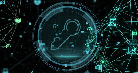 Image of cyber security and key in circle over network of connections on black background