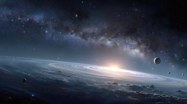 Asteroid ring orbiting a star in deep space with galaxy
