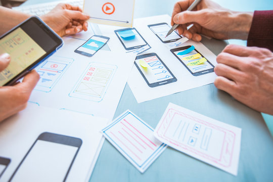 Panorama banner of startup UX developer or company employee design user interface or UI prototype for mobile application or website software with software display on laptop monitor in office. Synergic