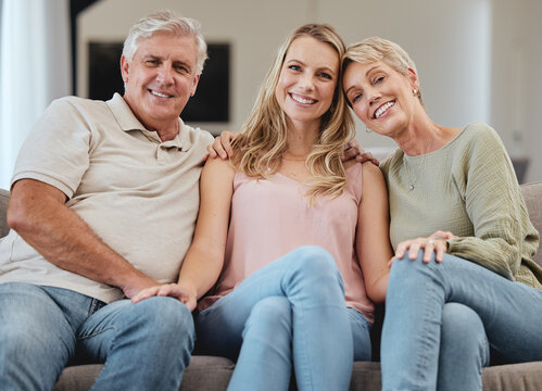 Support, relax and daughter with senior parents during a visit, family love and happy on the living room sofa. Smile, comfort and face portrait of a woman with elderly mother and father on the couch