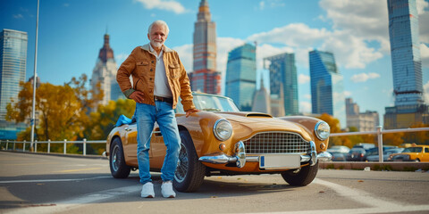 An elegant businessman, proud owner of a vintage car, embodies sophistication and style