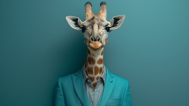 An imaginative portrayal of a giraffe dressed in a sleek turquoise blazer, blending realism with artistic whimsy, provoking thought about perception and identity.